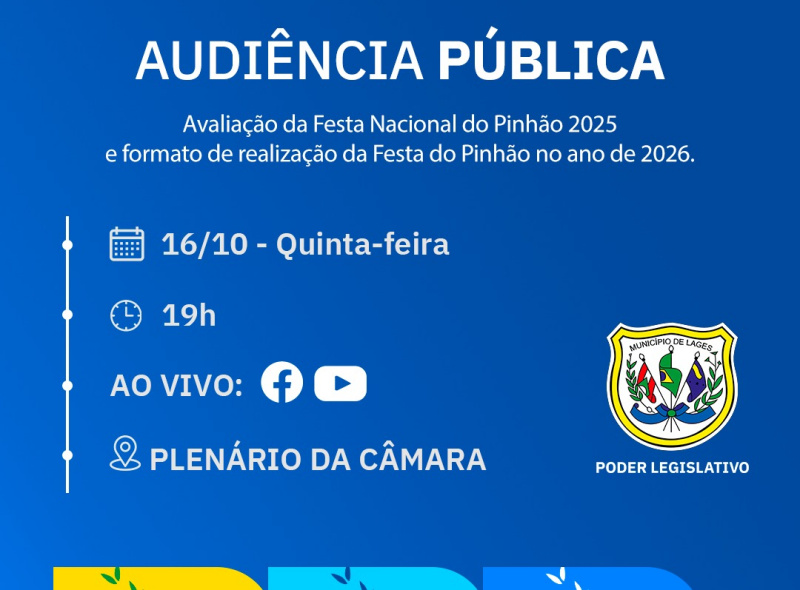Para avaliar o resultados da edição da Festa Nacional do Pinhão deste ano e o formato de realização da edição 2026, o Poder Legislativo promove audiência pública, marcada para esta quinta-feira (16), a partir das 19h, no Plenário Nereu Ramos.