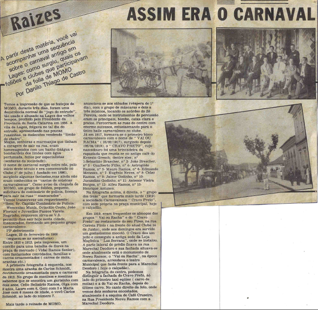 As pistas para entender de onde vem esta paixão estão guardadas em arquivos históricos. Em um dos recortes do jornal Correio Lageano, datado de 5 de março de 1991, estão preservadas crônicas dos “tempos d’antes”. Elas detalham o nascimento da paixão carnavalesca em Lages, preservando nomes e episódios que, de outra forma, teriam se perdido no tempo.