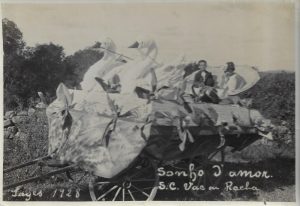 O Carnaval de rua dos anos 1920 também transformava o traçado urbano de Lages. De acordo com o arquivo, dezenas de automóveis de capota arriada eram ornamentados com flores naturais ou artificiais, tornando-se verdadeiros “ramalhetes ambulantes” que conduziam rainhas e blocos pelas ruas. As vias centrais, como a Rua Correia Pinto e a antiga XV de Novembro, ficavam tomadas por serpentinas lançadas sobre os fios de luz, criando um cenário que marcava a cidade por dias.